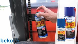 Olej uniwersalny B10 firmy BEKO. Olej charakteryzuje się dobrymi właściwościami penetrującymi oraz precyzją nanoszenia, którą umożliwia dozownik dołączony do puszki. Olej znajdzie zastosowanie w warsztatach samochodowych, budownictwie i przemyśle. Wypiera wodę, usuwa smołę, tłuszcze, resztki kleju oraz rozpuszcza resztki prochu w broni. Może być stosowany podczas odkręcania zapieczonych nakrętek i części, czyszczenia felg aluminiowych, smarowania zawiasów i przegubów.